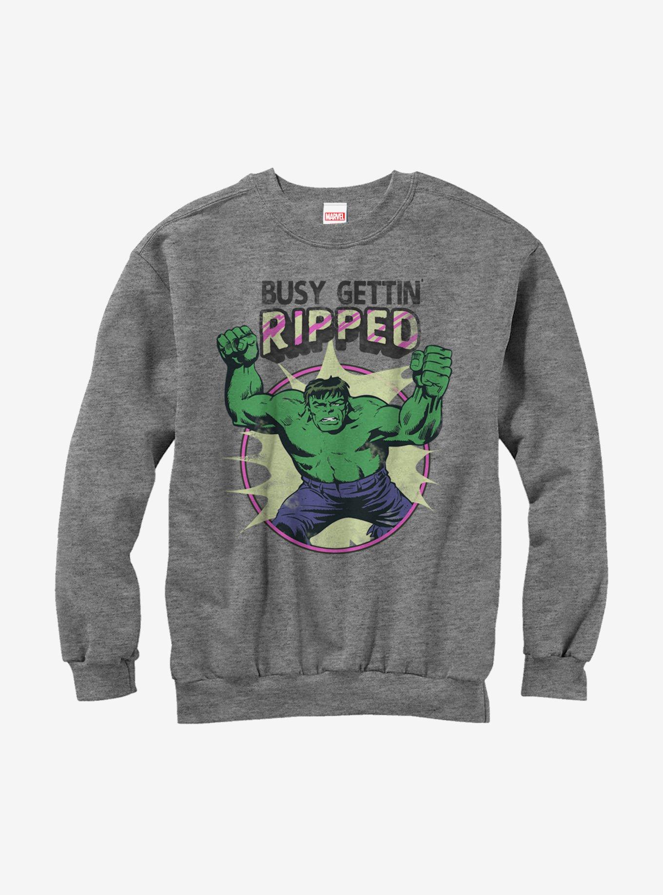 It's time to hulk up and bulk up with the Hulk on this sweatshirt! This cute boyfriend-cut Hulk sweatshirt portrays a vintage-style Hulk with the motto "Busy Getting Ripped" printed in distressed text above him.