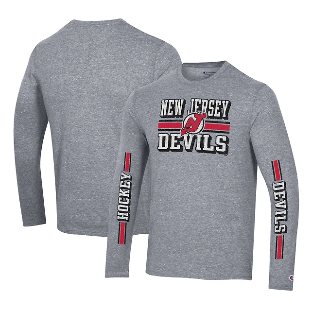 Men's Champion Heather Gray New Jersey Devils Tri-Blend Dual-Stripe Long Sleeve T-Shirt
