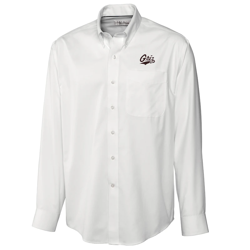 The Men's Cutter & Buck White Montana Grizzlies Big & Tall Epic Easy Care Fine Twill Long Sleeve Button-Down Shirt is the perfect way to show your support for the Montana Grizzlies. Made from a wrinkle-resistant cotton and polyester blend, this shirt is comfortable and easy to care for. It features a button-sleeve placket, embroidered graphic, and patch pocket, all proudly displaying your Montana Grizzlies pride. The shirttail hem and two-button adjustable cuffs add a touch of sophistication, making it perfect for any occasion.