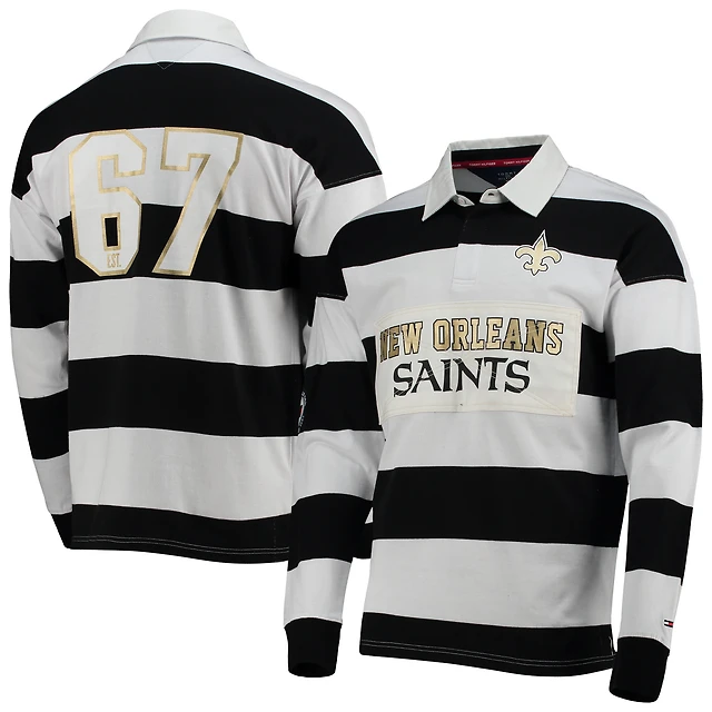 Men's Tommy Hilfiger Black/White New Orleans Saints Varsity Stripe Rugby Long Sleeve Polo