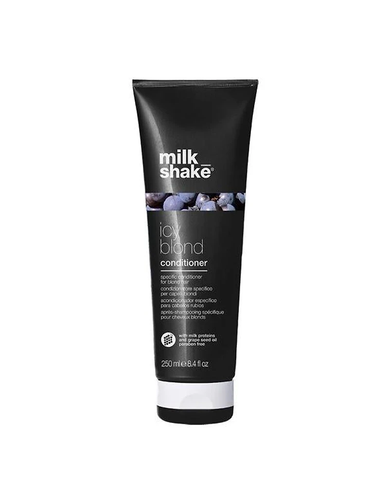 Milkshake Icy Blond Conditioner - 250ml Ideal for: very light blond or platinum blond hair Milkshake icy blond conditioner is a specific conditioner for blond hair. The special black pigment contain within the new milkshake icy blond range, gives delicate ash tones to very light blond hair or platinum blond hair. Prolongs the effects of grey or silver tones. Helps to neutralizes and counteracts unwanted yellow or brassy tones in blond hair. Is ideal for very light blond or platinum blond hair. Not recommended for grey or white hair. Paraben-Free. The active ingredients enhance the natural beauty of hair, leaving it soft and shiny. The sweet and evocative grape fragrance gives a delicious happy moment of joy during application. Helps to neutralizes and counteracts unwanted yellow or brassy tones in blond hair. Is ideal for very light blond or platinum blond hair. Not recommended for grey or white hair. Lightening techniques, external aggressors such as the sun, or harsh cleansers can bring out unwanted warm tones in blond hair. The special black pigment contained within the new milkshake icy blond range: