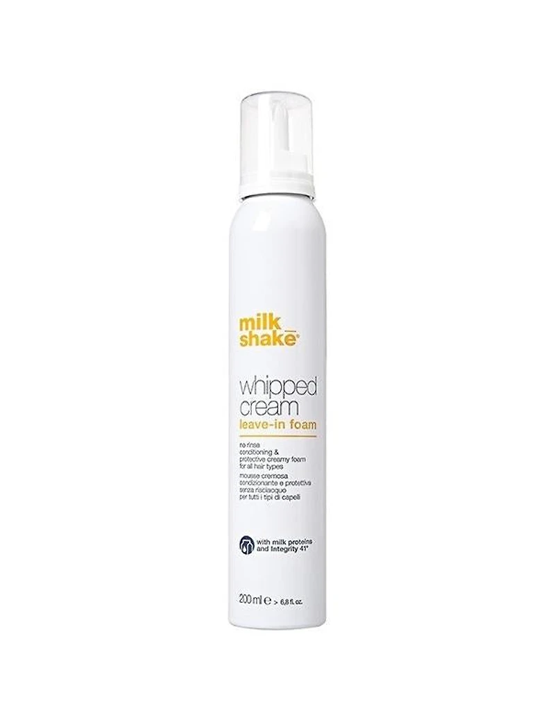 Milkshake Whipped Cream - 200ml Milkshake whipped cream is a versatile leave-in conditioner specifically created to maintain optimum moisture balance and to preserve the integrity of hair color. A simple and fast way to condition, the soft and creamy formula instantly makes hair soft and easy to comb without weighting it down. Milkshake whipped cream prevents static electricity and frizziness, and has a pleasant fragrance of sweet milk. Hair is soft, shiny and full of vitality. Milkshake whipped cream is a no-rinse conditioning and protective creamy foam for all hair types. This leave-in formula contains milk protein to condition and restructure hair, while providing softness and manageability without weighing it down. Integrity 41® helps to maintain hair color. Use Shake well and hold the can upside down to dispense. Apply by massaging it on clean and towel dried hair. Proceed with the desired styling.