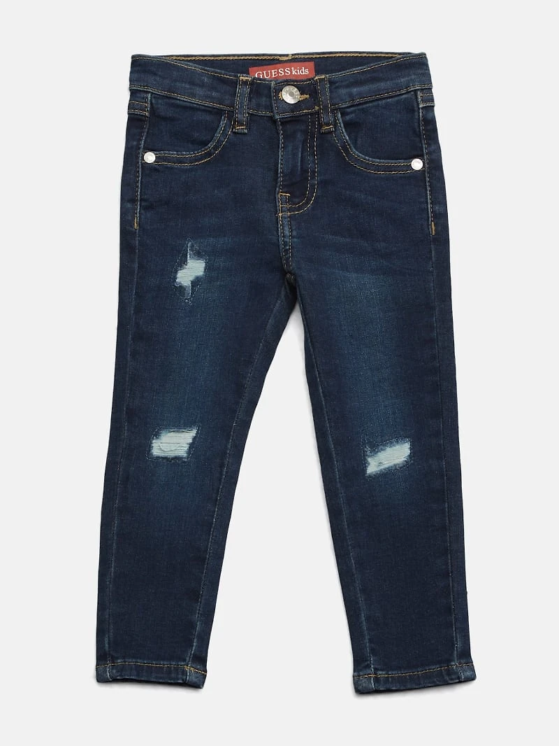 Twin with your little one in these medium-wash skinny jeans featuring a distressed front, intentional fading, whiskering and a rhinestone logo back pocket.