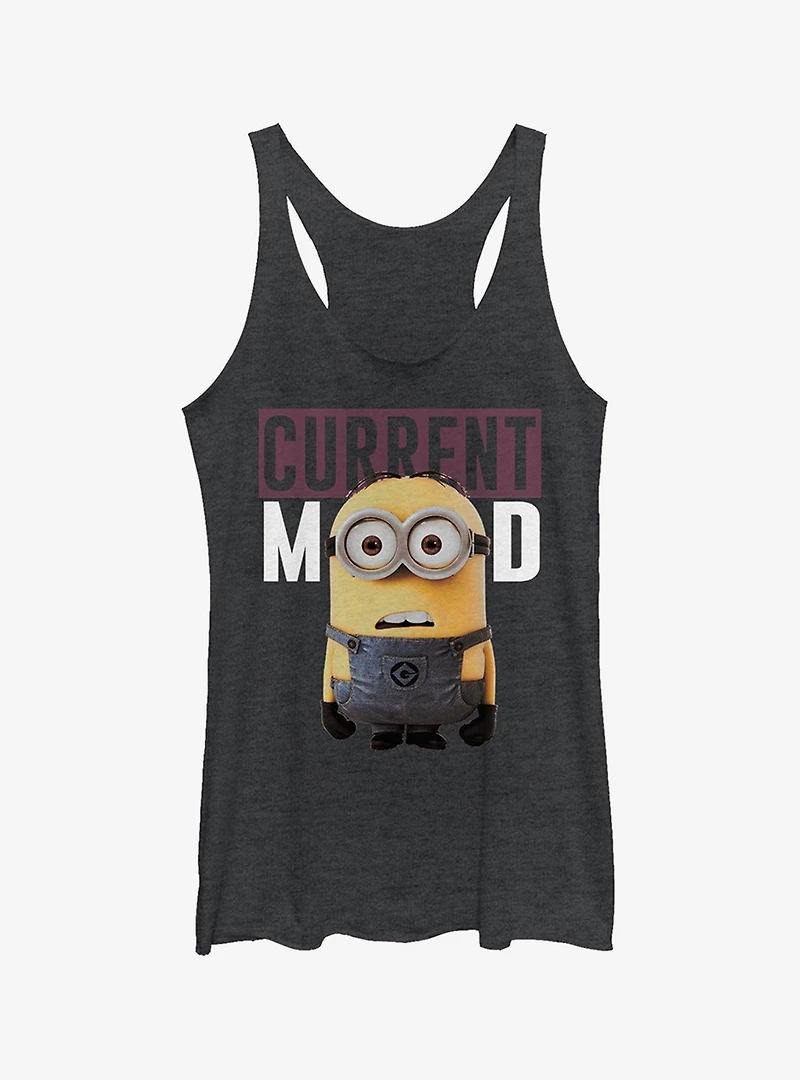 You may not know what they are saying, but you always know how they feel with the Despicable Me Minions Current Mood Women's Racerback Tank Top. Dave the Minion is portrayed with "Current Mood" on this funny relaxed-fit Despicable Me tank top.