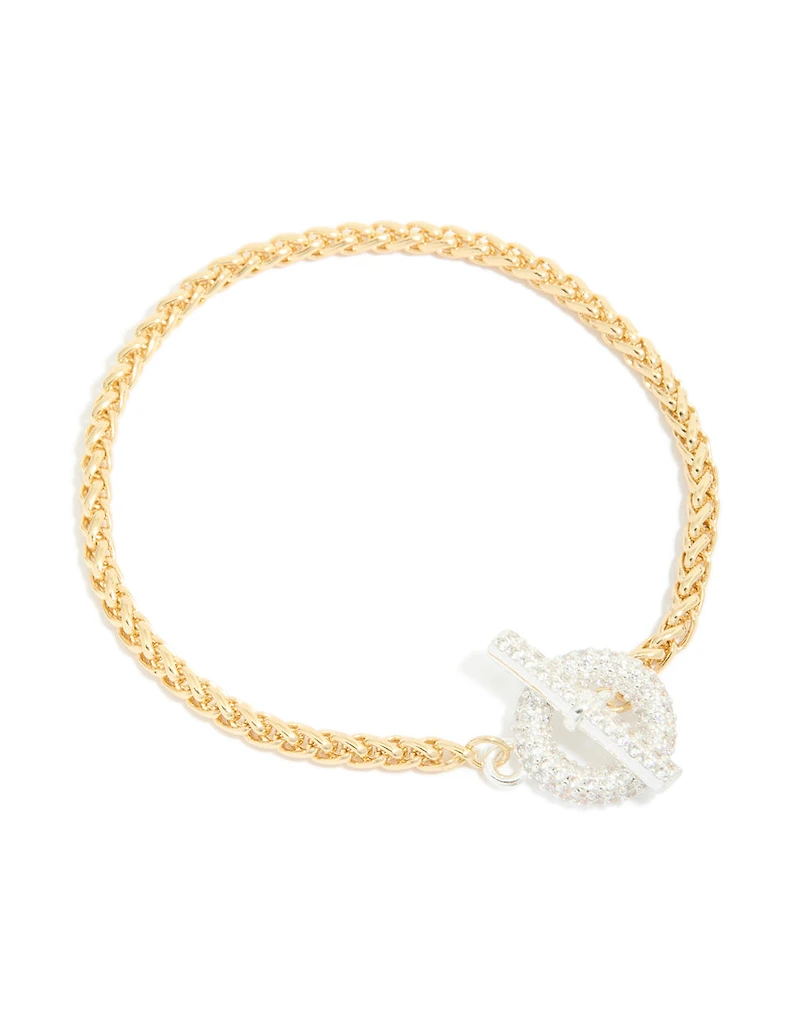 Turn up the shine with this Mixed Metal Plated Cubic Zirconia T & O Chain Bracelet. This stylish mixed metal bracelet pairs a sleek gold plated chain with a silver plated T & O feature set with shimmering cubic zirconia crystals. Perfect for everyday wear, nights out or stacking with other chain bracelets and bangles, this T bar bracelet adds a modern, polished touch to any outfit. Wear it with jeans and a tee, a blazer, or your favourite dress for instant, effortless style. Dimensions: Length; 16.5 cm