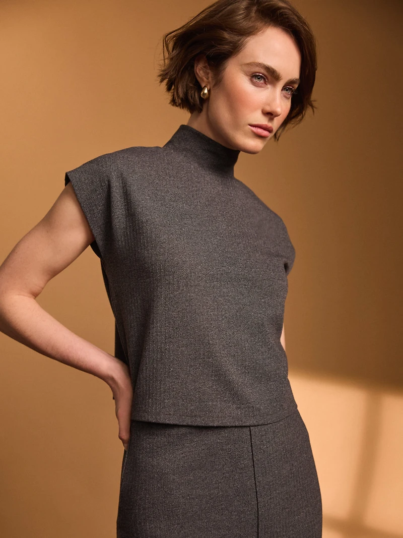 A little sporty, a little sleek - this mock neck cropped top brings instant attitude to any outfit. The boxy fit and soft jacquard knit give it that easy, structured feel that always looks put together. Pair it with the matching bottom or style it with denim for a look that's cool without even trying. Matching SKIRT available in limited stock. Knit top Short drop shoulder sleeves Mock neck Stretch melange Jacquard knit Boxy Cropped Isabelle is 5.8" and wearing size S Fabric: 50% viscose, 25% polyester, 22% nylon, 3% spandex Machine wash in cold water Hang to dry