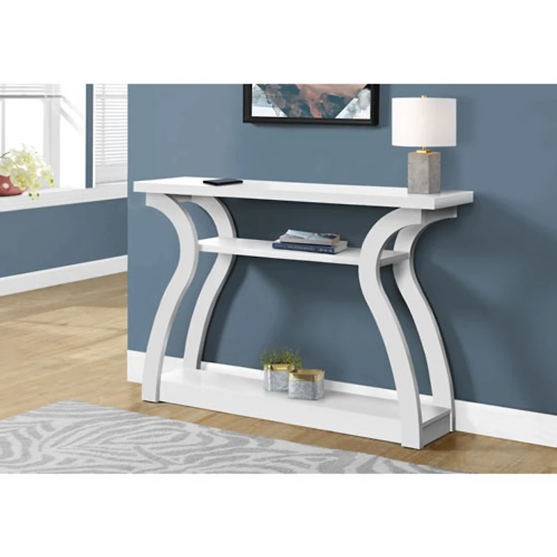 Three shelves provide plenty of space for a lamp, photos, home décor, and more Contemporary styling boasts clean lines with bold curved sides Crafted from laminated MDF for long-lasting durability Clean white finish pairs effortlessly with your existing décor Assembly required Dimensions: Width: 120.02cm (47.25"); height: 81.28cm (32"); depth: 29.21cm (11.5")