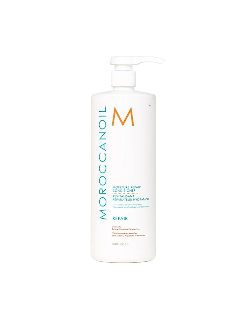 Moroccanoil Moisture Repair Conditioner - 1L Restore hair damaged by chemical processing, color or heat styling. Moroccanoil® Moisture Repair Conditioner detangles and conditions to leave hair hydrated, strong and manageable. Its concentrated formula restores elasticity and moisture with reconstructive keratin and antioxidant-rich argan oil. Color-safe. Sulfate-free, phosphate-free and paraben-free. How To After shampooing, squeeze excess water and apply conditioner from mid-length to ends. Leave on for 1–2 minutes and rinse well. Use regularly with Moroccanoil Moisture Repair Shampoo for best results.