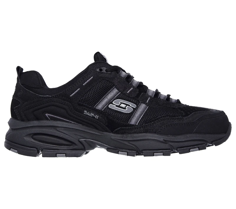 Get even more sporty style and comfort out of the SKECHERS Vigor 2.0 - Trait shoe. Leather, synthetic and mesh fabric upper in a lace up athletic training sneaker with stitching and overlay accents. Memory Foam insole.Smooth trubuck leather upperDurable lightly textured synthetic overlaysMesh fabric side panels for cooling effectLace up athletic training sneaker designStitching accentsSide stripe overlaysSide S logoLayered front and side overlay detail for added stability and durabilityLace up frontPadded collar and tongueSoft fabric shoe liningMemory Foam full length cushioned comfort insoleShock absorbing supportive midsoleStabilized midfoot and heelFlexible rubber traction outsole1 1/4 inch heel