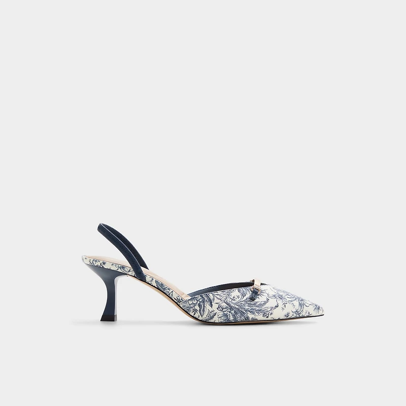 A sophisticated sling back kitten heel that effortlessly transitions from brunch to wedding guest looks. This chic style features a white and blue floral print that captures the essence of summer elegance, complemented by delicate gold hardware that adds a refined touch. The closed pointy toe silhouette delivers timeless sophistication, while the kitten heel provides all-day comfort without compromising on style. Whether you're attending a day event or dressing up for a special occasion, the Nailah offers the perfect balance of comfort and elegance for any summer gathering.