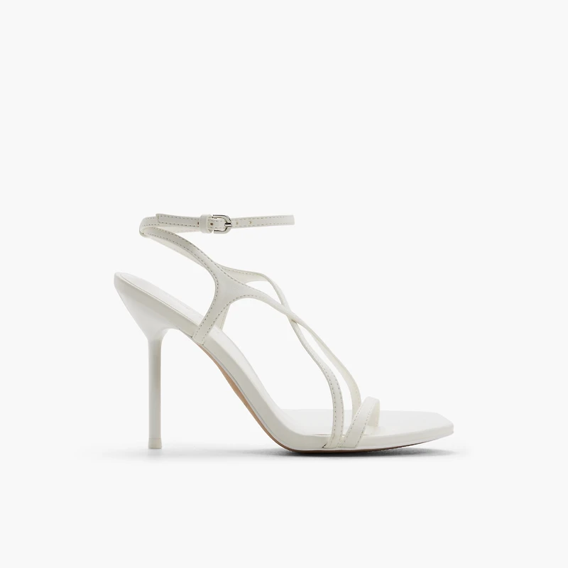 Nalanii in white is sleek and refined with a sultry edge. Featuring a slim stiletto heel, delicate crisscross straps and a supportive ankle strap, she balances elegance with allure. The almond toe softens the silhouette, making her a modern choice for bridal moments or elevated summer looks.