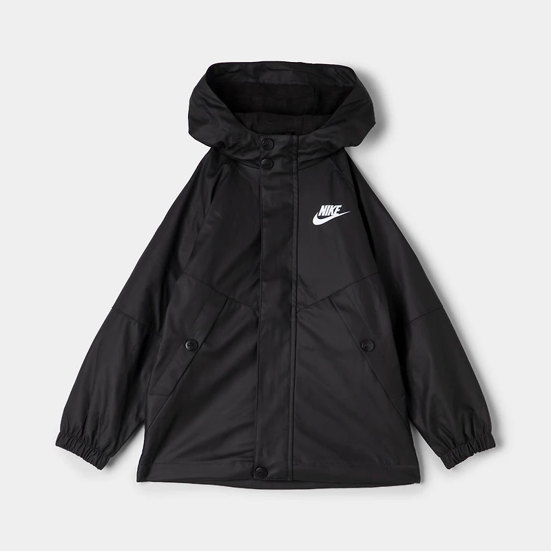 The Nike Children’s Rain Jacket "Black" is built to keep kids dry, warm, and comfortable in light rain and cooler days. With its water-repellent shell, cozy fleece lining, and practical details like secure pockets and a snap storm flap, this jacket is perfect for outdoor play and everyday adventures, rain or shine.
