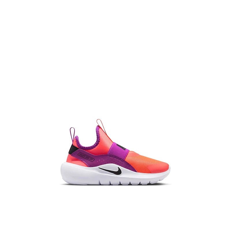 Designed for getting into fun fast, the Flex Runner 4 is made to be easy for kids to pull on. Its bootie-like design is flexible with stretchy straps that secure their fit. Flex grooves in the outsole allow little feet to move naturally, helping little ones find their footing. What's New You spoke and we listened. For the Flex Runner 4, we've updated the fit of the midfoot strap and the collar to help make these easy for kids to slip on and comfortable enough to wear all day. Pull on and go Pull tabs on the heel and tongue work with a stretchy inner sleeve to help make these shoes easy for kids to put on themselves. Elastic straps run behind the heel and across the top of the foot to provide a snug, secure feel. Play anywhere Flex grooves in the outsole add flexibility, helping every step feel natural. Multi-surface traction works with sturdy foam that wraps around the heel to provide grip and stability when kids shift directions. Durable comfort and support We reinforced the toe box and used durable materials throughout to help these kicks stand up to how kids play. Soft, springy foam in the midsole helps cushion their every step.