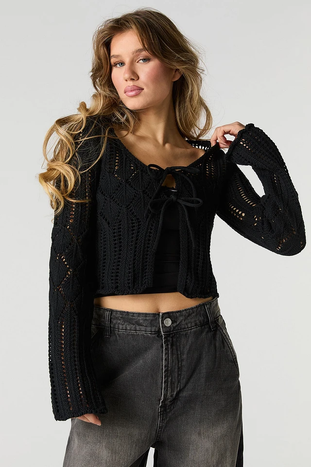 Open Knit Tie Front Flyaway Sweater