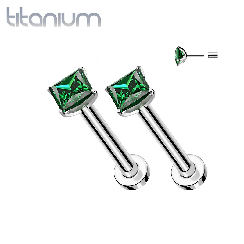Pair of Implant Grade Titanium Threadless Square Emerald Green CZ Gem Earring Studs with Flat BackPair of Implant Grade Titanium Threadless Square Emerald Green CZ Gem Earring Studs with Flat BackPair of Implant Grade Titanium Threadless Square Emerald Green CZ Gem Earring Studs with Flat Back