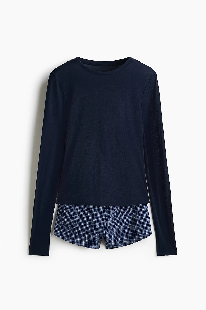 Pajamas with a top in soft jersey and shorts in cotton seersucker. Top with a round neckline, long sleeves, and raw edges at cuffs and hem. Shorts with a picot-trimmed elasticized waistband, a mock button fly, and a slit at hems.