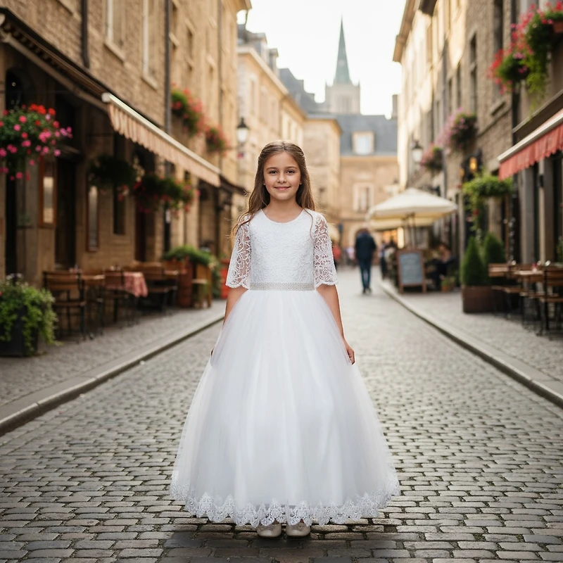 Paparazzi White Designer Flower Bud Bodice With Lace Sleeves