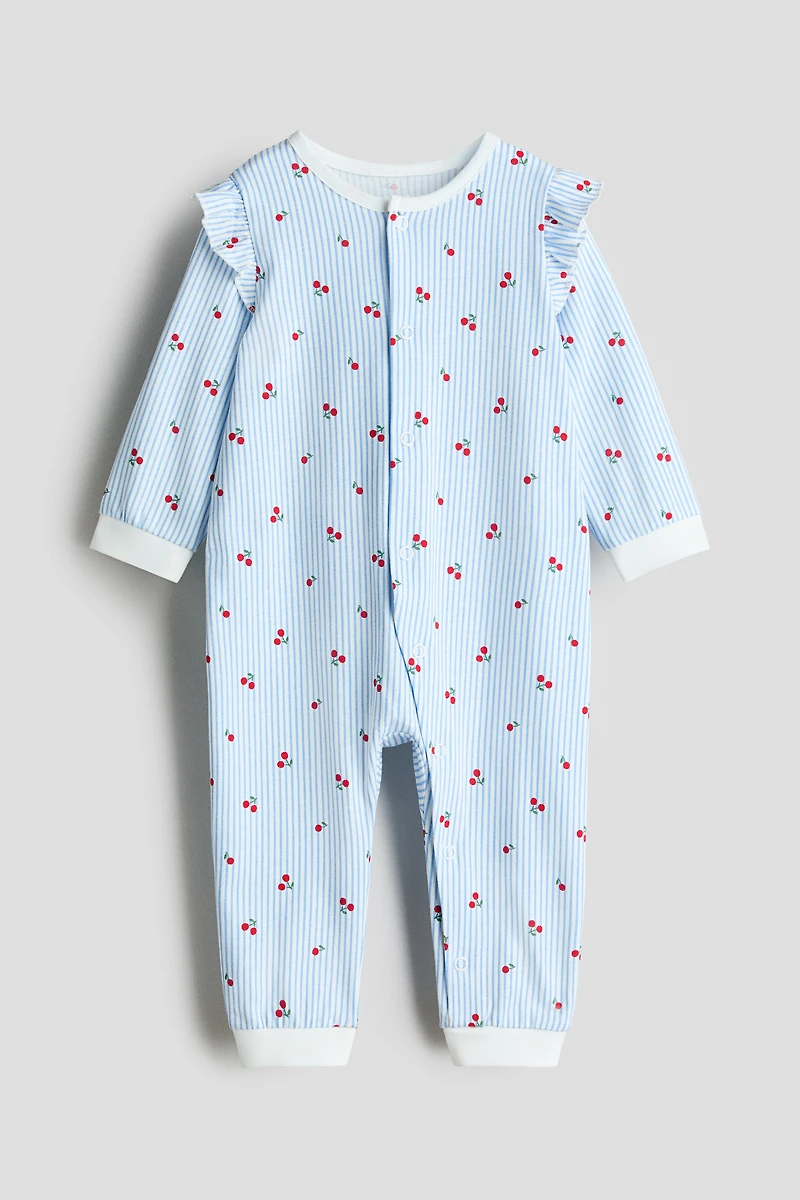 Pajama jumpsuit in supersoft cotton jersey with a printed pattern. Long sleeves, long legs, and trim at cuffs and hems. Snap fasteners at front and along one leg for easy changing.
