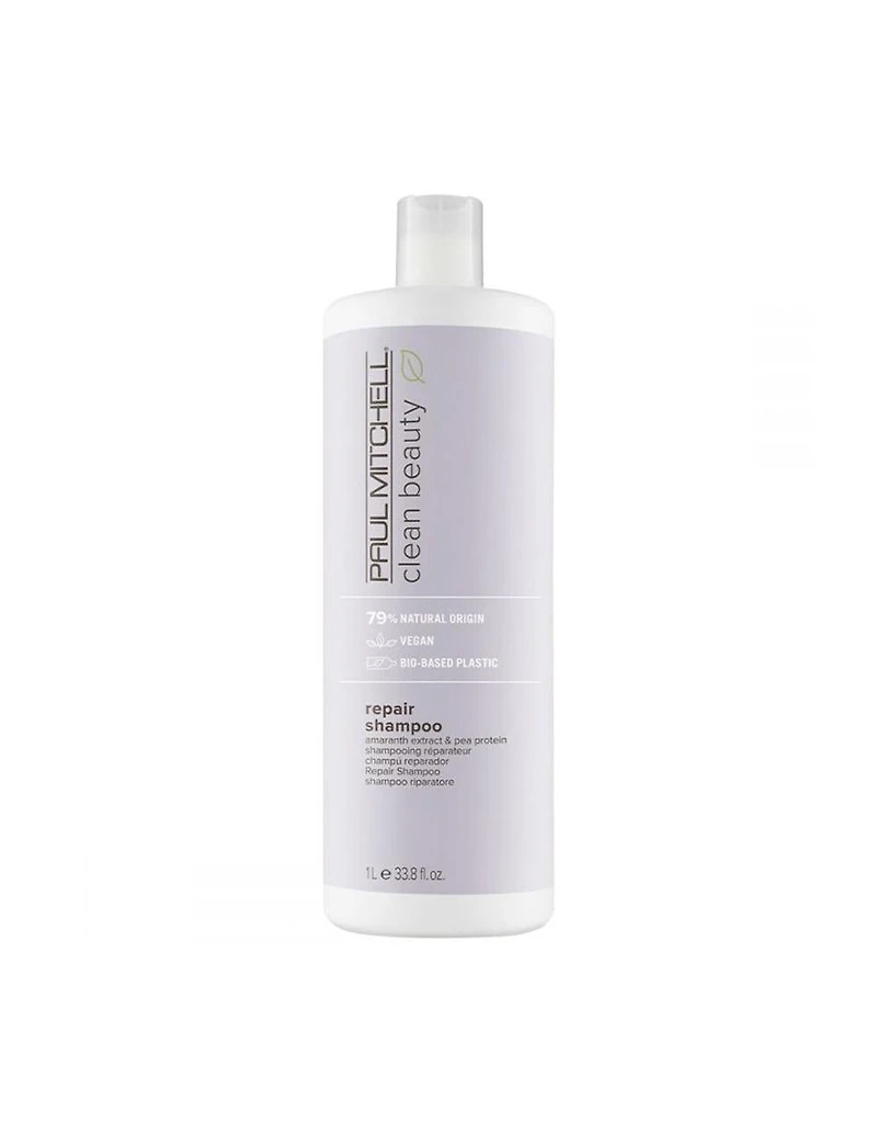 Paul Mitchell Clean Beauty Repair Shampoo - 1L STRENGTHENS • PROTECTS Strengthen fragile hair with plant-based power. This shampoo from Paul Mitchell Clean Beauty helps to repair and protect strands while it washes away dirt and buildup with a gentle sulfate-free lather. Made with organic amaranth extract and vegan pea protein, it helps strengthen damaged, brittle hair while helping to protect strands from further damage. Handcrafted with sustainably sourced ingredients of 79% natural origin that deliver professional results in recyclable, bio-based packaging made from sugarcane, so you can rinse, repair and repeat knowing your shampoo is good for your hair and for the earth. What's Inside: Amaranth Extract: Provides amino acids that help strengthen hair and repair damage. Pea Protein: Helps keep hair hydrated and prevents breakage. Balances moisture to help maintain elasticity. Hair Type Good for Damaged, Brittle Hair. Fragrance Delicate rose peach blossom scent. How To Apply a small amount. Massage. Rinse. Follow with conditioner.