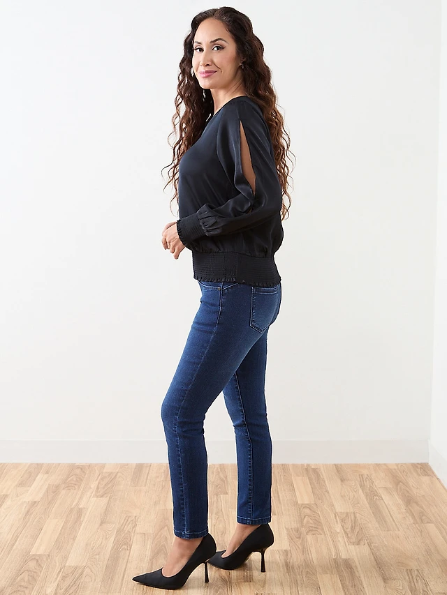 Petite Slit Long-Sleeved Satin V-Neck Blouse