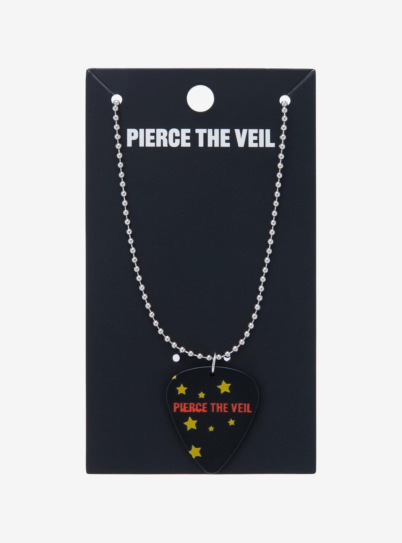 Shred alongside Pierce the Veil with this ball chain necklace! Featuring a guitar pick pendant highlighting the band's name with little star detailing.