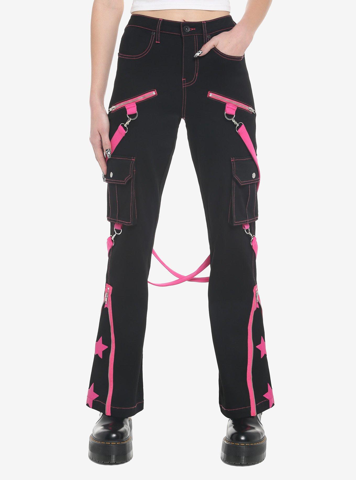 Stand out in these suspender cargo pants. They're black with pink contrast stitching, pink suspenders, pink zippers and pink stars printed on the legs and back pockets.