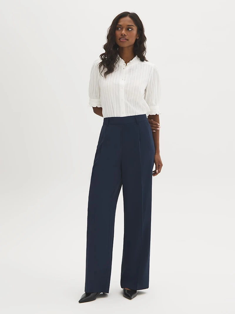 This is the kind of pant that does the styling for you. A wide-leg silhouette with a soft front pleat creates an easy, confident look, finished with a comfortable pull-on waistband. The result feels polished, relaxed, and ready for repeat wear.Woven pantsTricotineWide-legPull-on1/2 back elasticOne pleatTrouser pocketsJay is 5.8" and wearing size Fabric: 100% polyesterMachine wash inside out in cold waterHang to dry