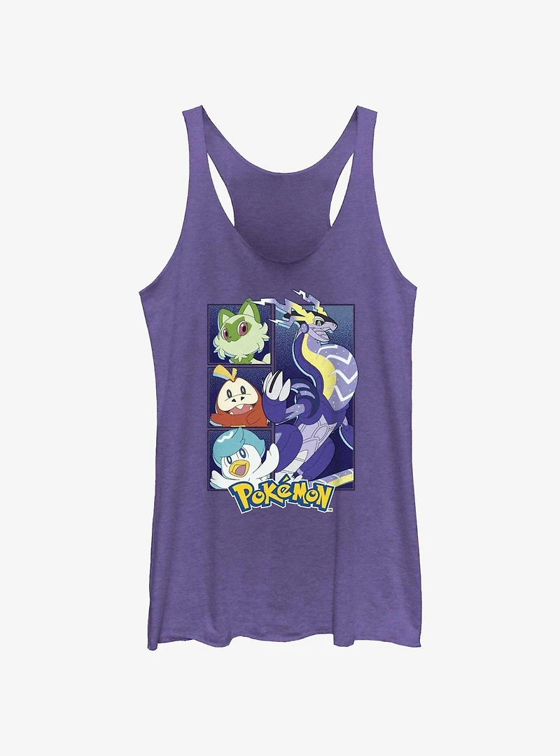 Legendary Pokémon Miraidon -- from Pokémon Violet -- appears with Sprigatito, Fuecoco and Quaxly on this fashionably powerful racerback tank.