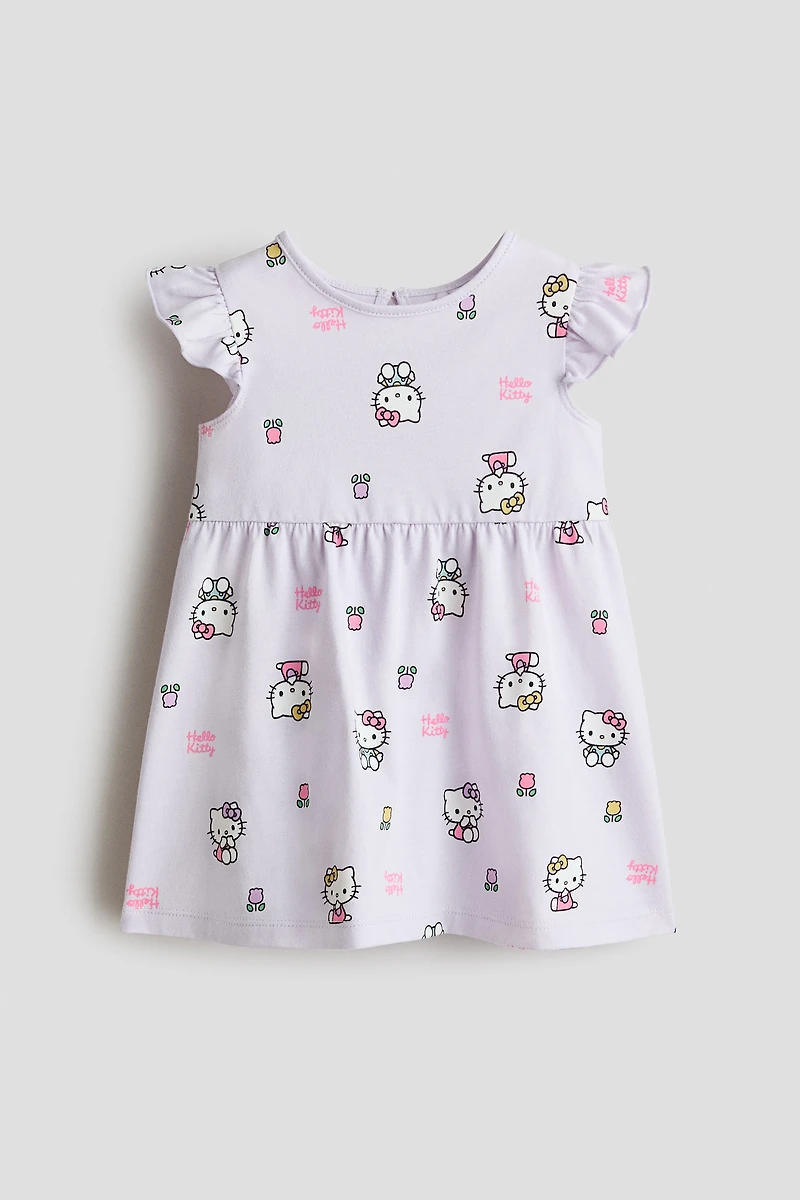 Dress in soft cotton jersey with a printed design. Round neckline, keyhole opening at back with a button, and gathers above a flared skirt. Flutter sleeves.