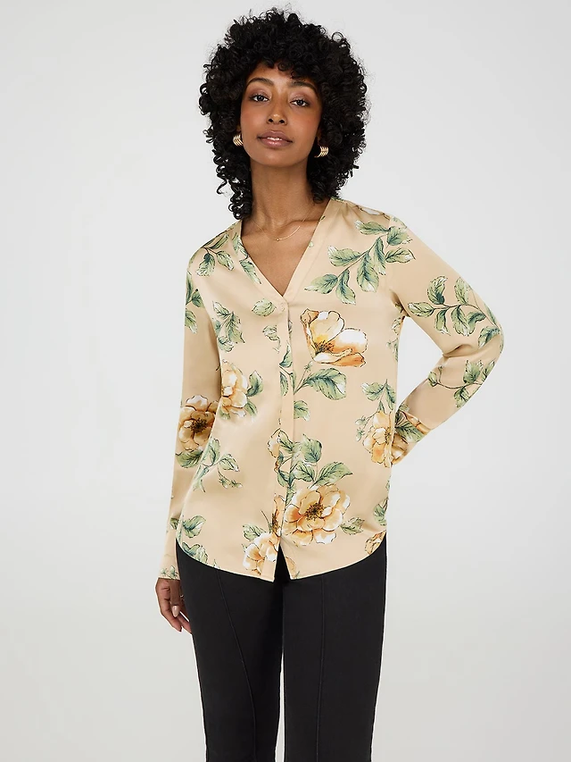 Printed Satin V-Neck Button-Front Blouse