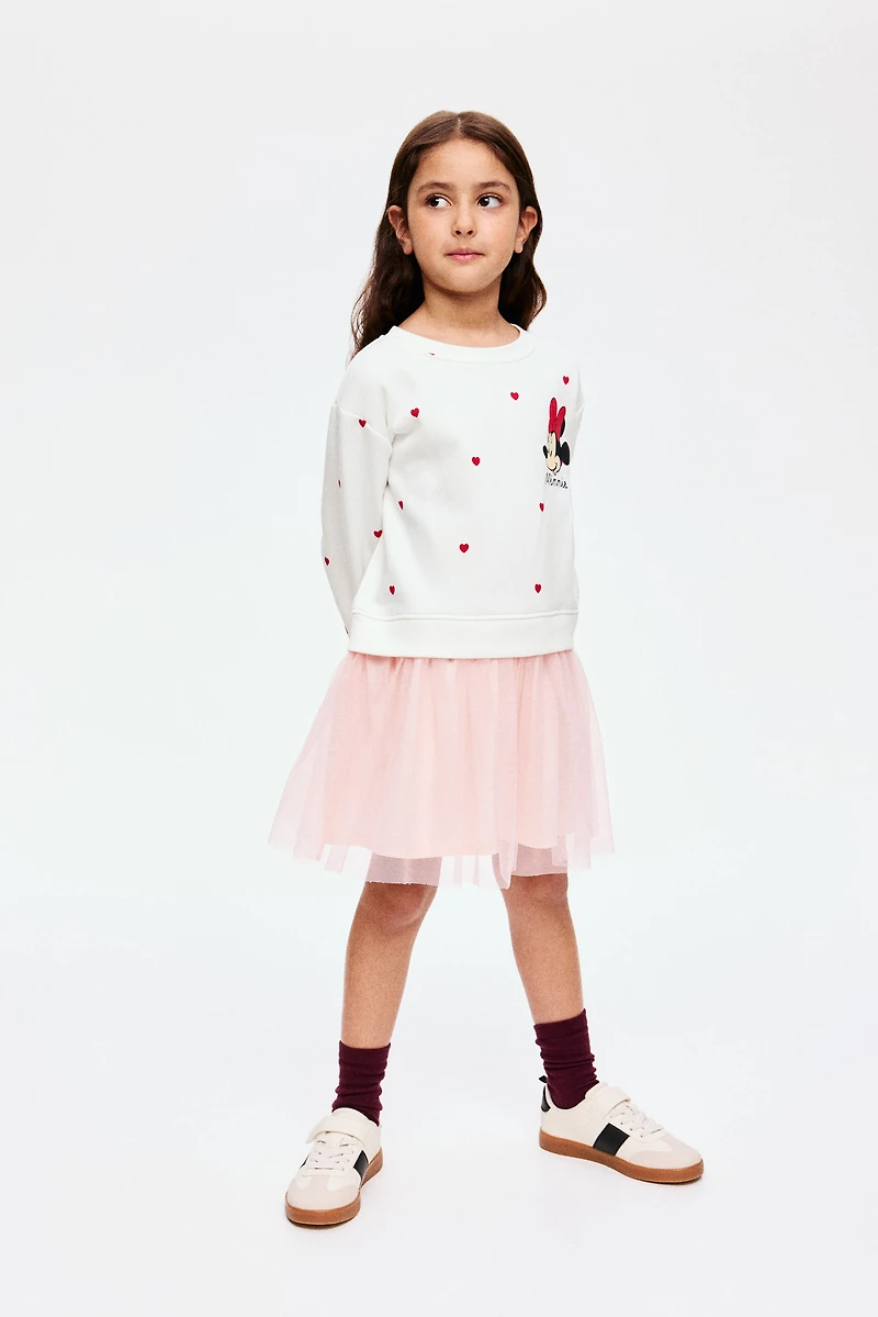 Loose-fit sweatshirt dress with a printed design and skirt with outer layer in tulle. Round neckline, dropped shoulders, and long sleeves. Ribbing at neckline, cuffs, and hem. Soft, brushed inside. Lined.
