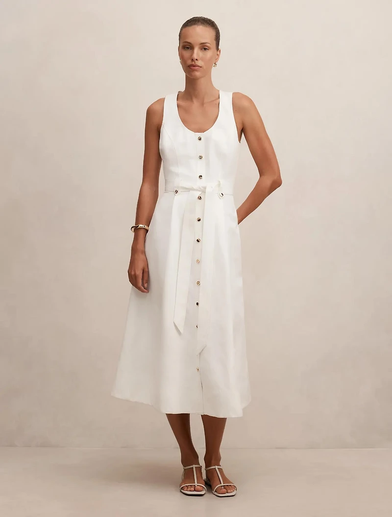 A sleek white midi dress with polished gold-tone accents, perfect for bringing vibrant energy to birthday celebrations and sunny garden parties.