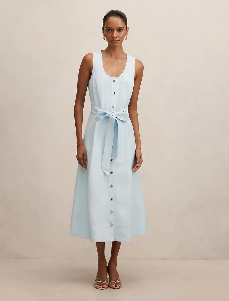 A sleek midi dress with polished gold-tone buttons, perfect for bringing vibrant energy to birthday celebrations and sunny garden parties.