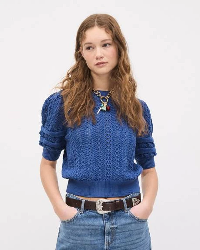 Puffy-Elbow-Sleeve Crew-Neck Sweater with Pointelle Stitches