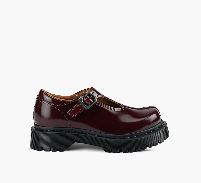Dr. Martens’ Rejena Mary Jane brings attitude to a classic: a squared bump toe and bold strap set on an elevated Bex sole for modern edge. The adjustable buckle and signature welt stitch ensure comfort and durability—crafted in smooth leather for a look that’s equal parts heritage and statement.