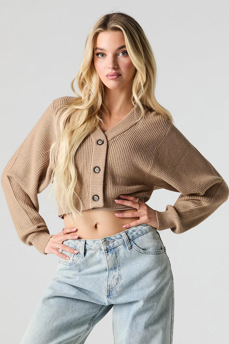 This cardigan features ribbed knit material, button-up front, V-neckline, long sleeves, and cropped hem.