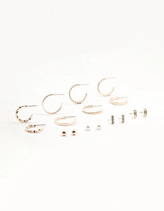Rose Gold Diamante Pearl Hoop Earrings 8-Pack