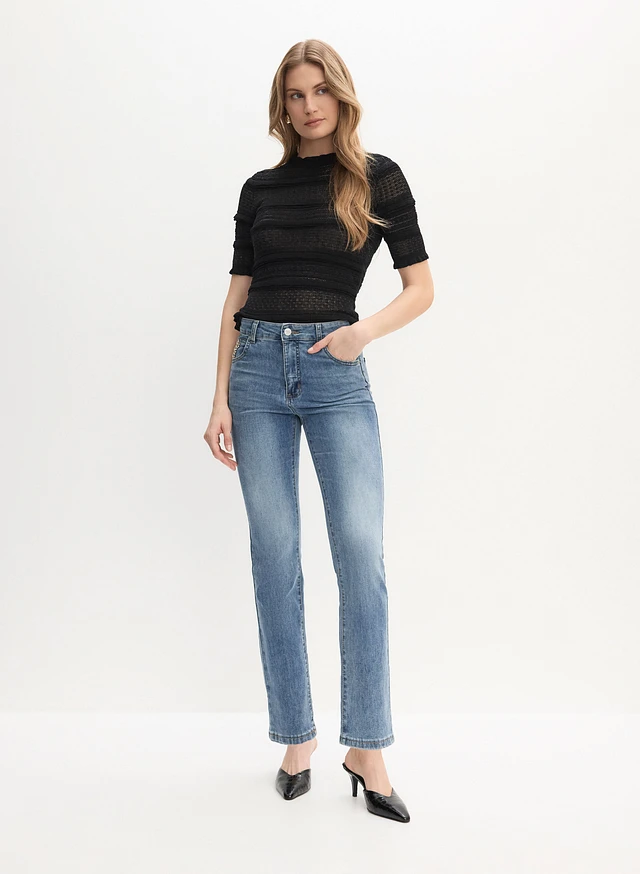 Ruffle Short Sleeve Blouse & Rhinestone Detail Straight Leg Jeans