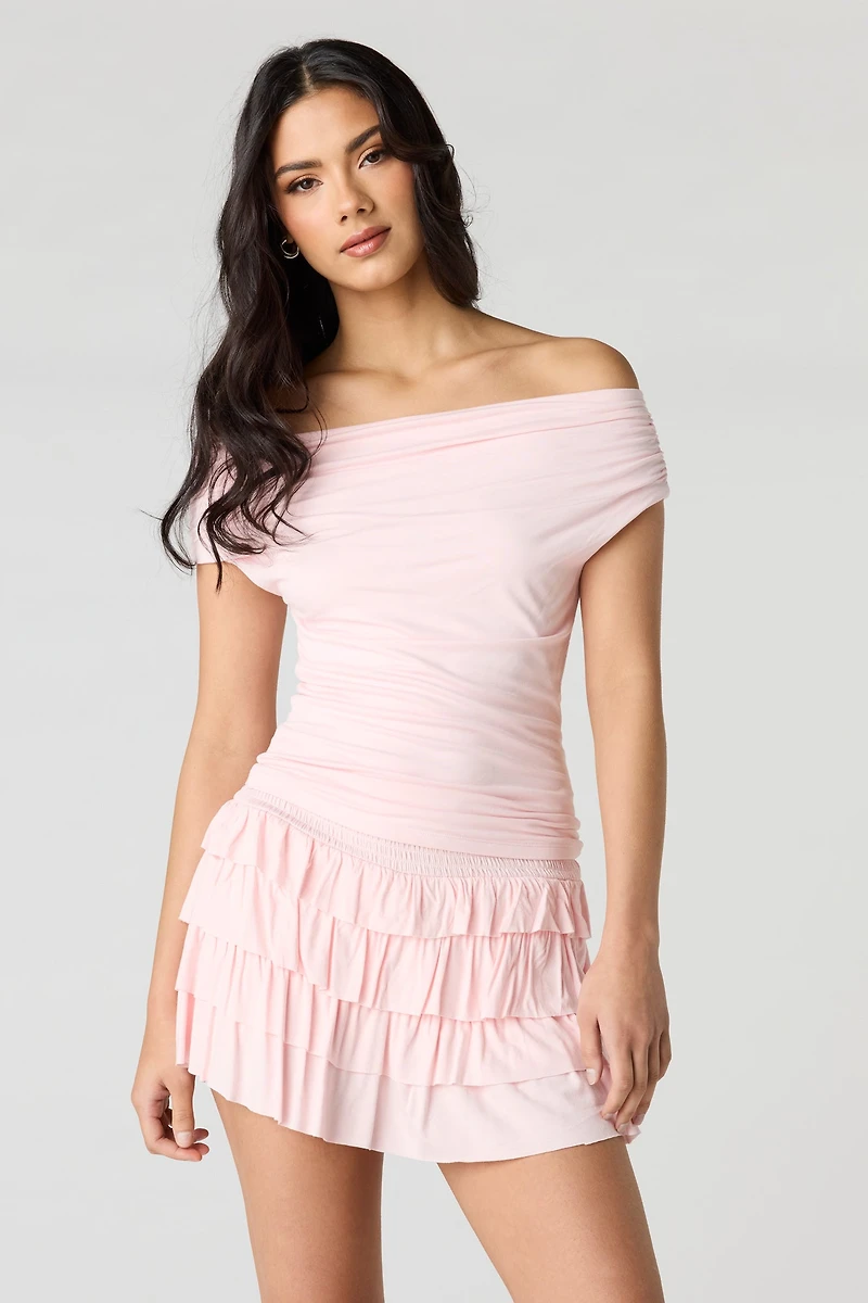 This skort features elastic waist, tiered construction, ruffle trim, mini length, and built-in short.