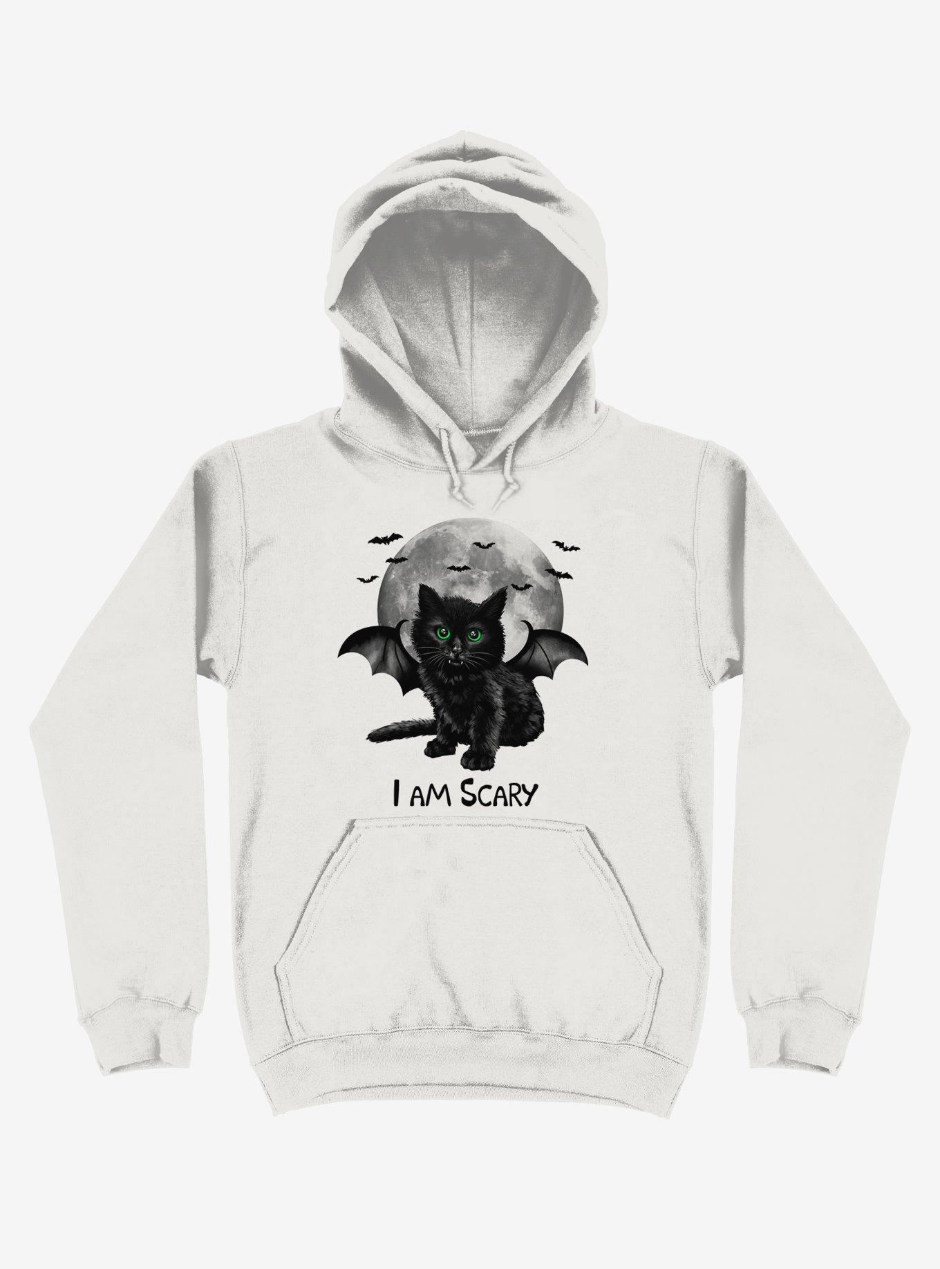 As if! This white pullover hoodie features an adorable black cat with bat wings declaring, "I am scary." Whatever you say, boo. Officially licensed art from Vincent Trinidad.