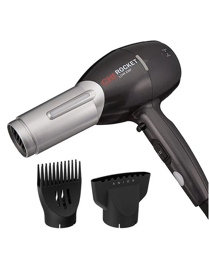 Le sèche-cheveux CHI Rocket hydrate et fait briller les cheveux tout en réduisant les frisottis et l'électricité statique. Sa poignée ergonomique assure confort et équilibre pendant le coiffage, tandis que la technologie ionique hydrate tous les types de cheveux. Le sèche-cheveux CHI Rocket est équipé d'un peigne et offre une puissance de 1800 watts, un flux d'air et une chaleur puissants, pour un séchage rapide et silencieux. Il améliore la brillance tout en réduisant l'électricité statique et les frisottis, pour des cheveux plus brillants, plus lisses et plus sains.