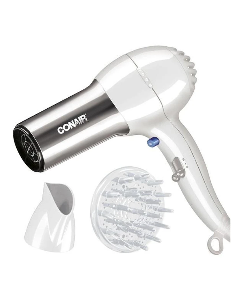 Sèche-cheveux ionique en céramique chromée Conair blanc Réduisez les frisottis et améliorez votre contrôle grâce au sèche-cheveux Conair 1875 watts à technologie ionique. Ce sèche-cheveux est doté d'une technologie ionique avec des ions négatifs qui neutralisent les charges positives de l'air afin de réduire l'électricité statique et les frisottis rebelles. Il minimise l'électricité statique dans vos cheveux, les rendant soyeux et brillants. La technologie céramique tourmaline diffuse une chaleur uniforme pour un séchage rapide et moins de dommages. Ce sèche-cheveux offre 3 réglages de chaleur et 2 vitesses différents : combinez-les selon la texture et la longueur de vos cheveux ou selon votre style. Terminez ensuite avec un jet d'air froid grâce au bouton air froid pour fixer la coiffure souhaitée. 1875 watts pour une puissance maximale. 3 réglages de chaleur/2 vitesses pour tous les types de cheveux. Le bouton de tir froid verrouille le style. La céramique tourmaline protège les cheveux grâce à une répartition uniforme de la chaleur. La technologie ionique réduit l'électricité statique, les frisottis et les mèches rebelles tout en ajoutant de la brillance. Comprend un concentrateur pour un coiffage précis et un diffuseur pour un coiffage en volume. L'anneau de suspension offre un rangement facile. Filtre amovible pour un nettoyage pratique, prolongeant la durée de vie du sèche-linge. Modèle n° 256WRXC