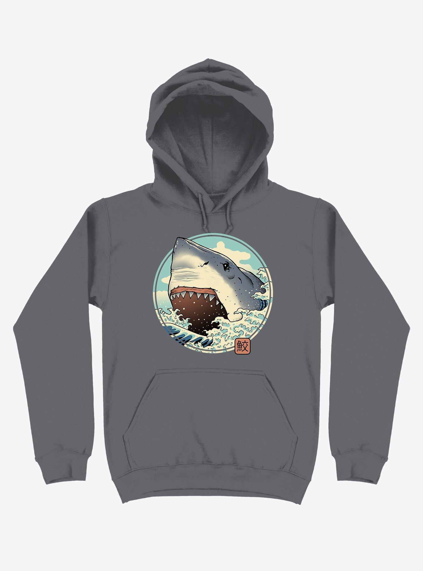 Where else can you find a sweatshirt inspired by traditional Japanese woodblock prints of the Edo period and... sharks?! Thought so. This asphalt grey pullover hoodie showcases a shark attack like no other. Officially licensed art from Vincent Trinidad.