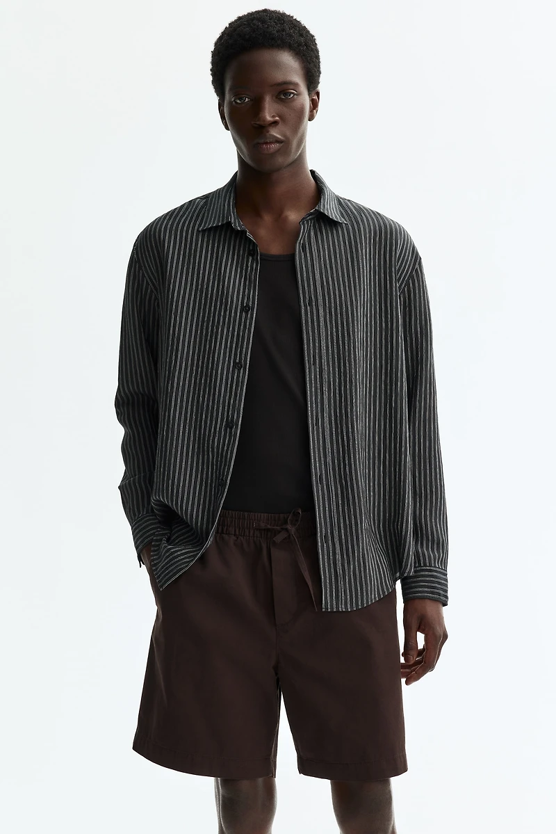 Short en sergé de coton souple. Modèle avec élastique et cordon de serrage à la taille. Fausse braguette. Poches italiennes et poche raglan derrière. Coupe décontractée qui crée une silhouette confortable sans être trop grande.