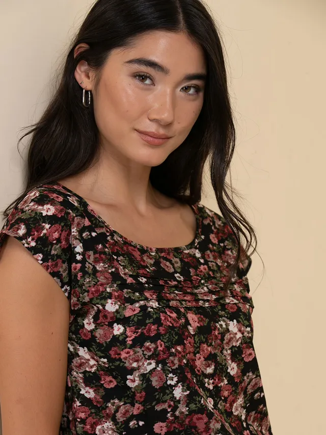 Short Sleeve Pleated Pintuck Scoop Neck Blouse