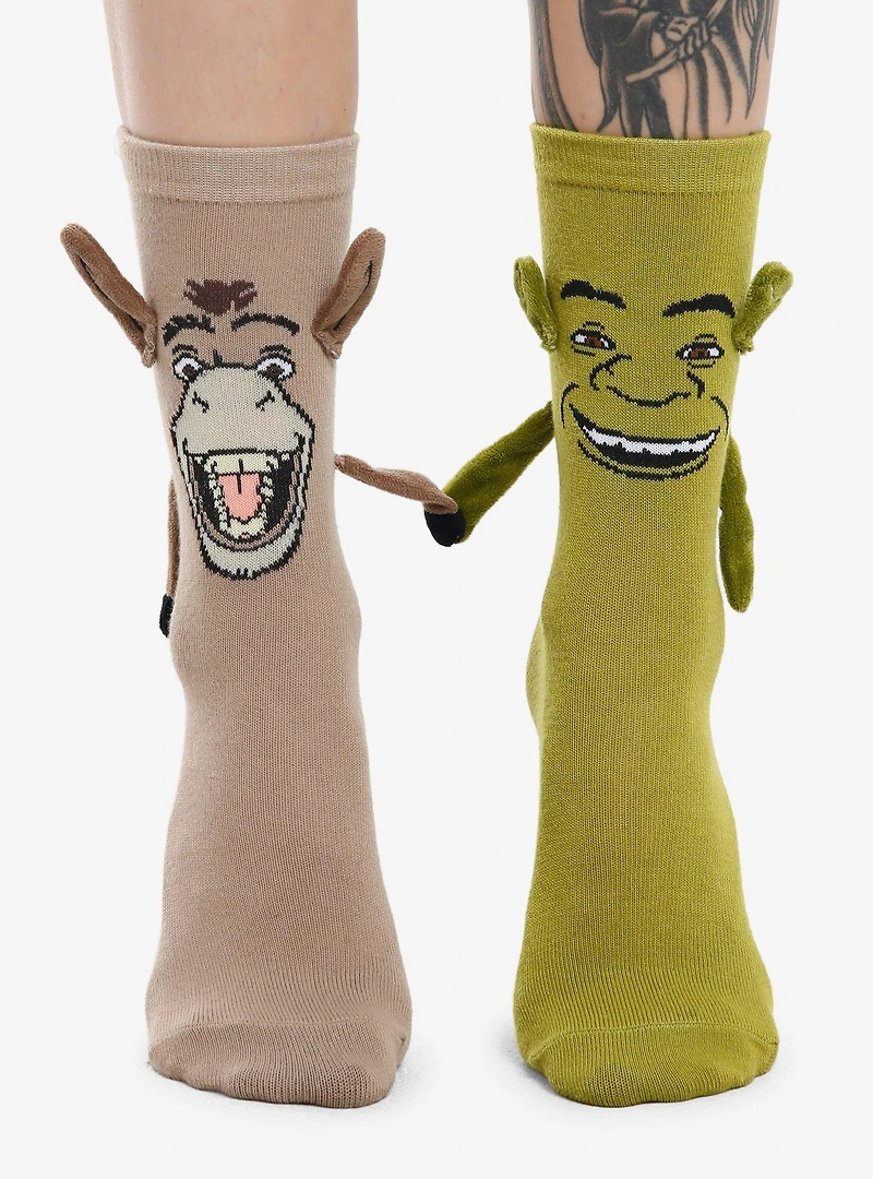 Feelin' all alone on your way to the castle? All you need are these socks starring Shrek and Donkey, 'cause you gotta have friends ! These crew socks have Shrek and Donkey designs with 3D ears and magnetic hands so they can hold each other!