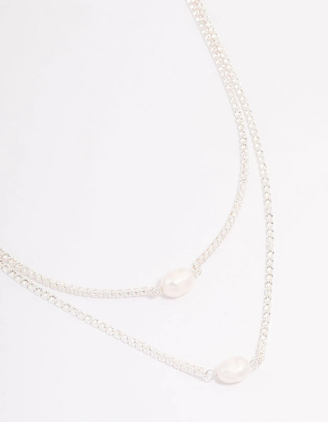 Silver Cubic Zirconia Multi-Row Pearl Necklace