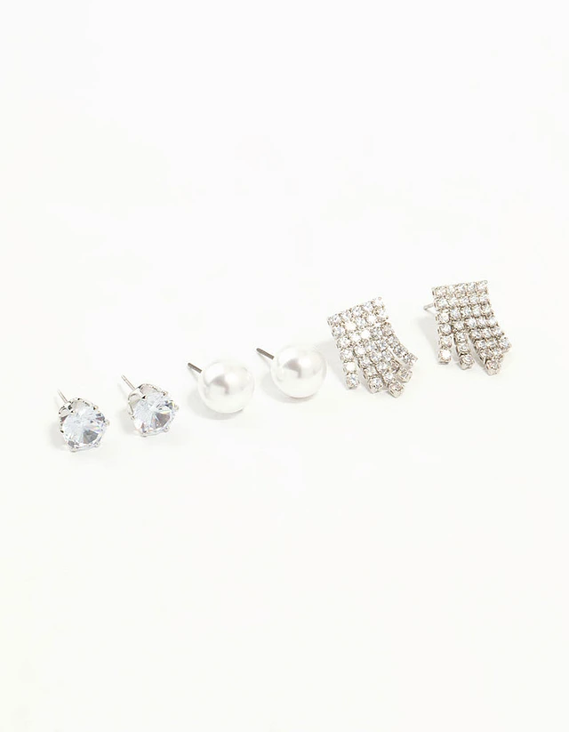 Silver Cubic Zirconia Tassel & Pearl Earrings 3-Pack