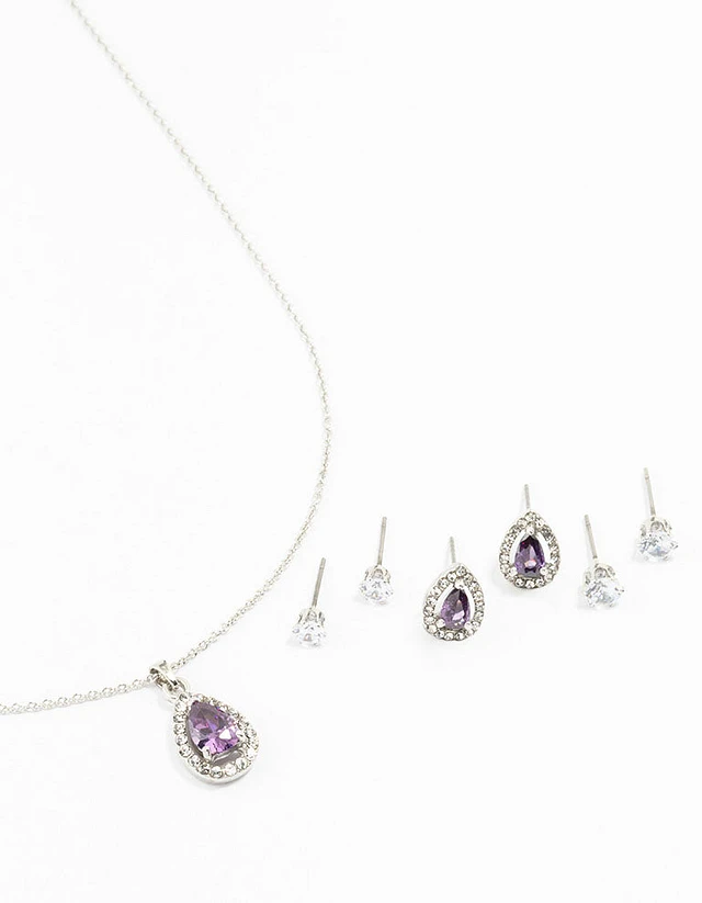 Silver Multiple Purple & Silver Pear Earring & Necklace Set