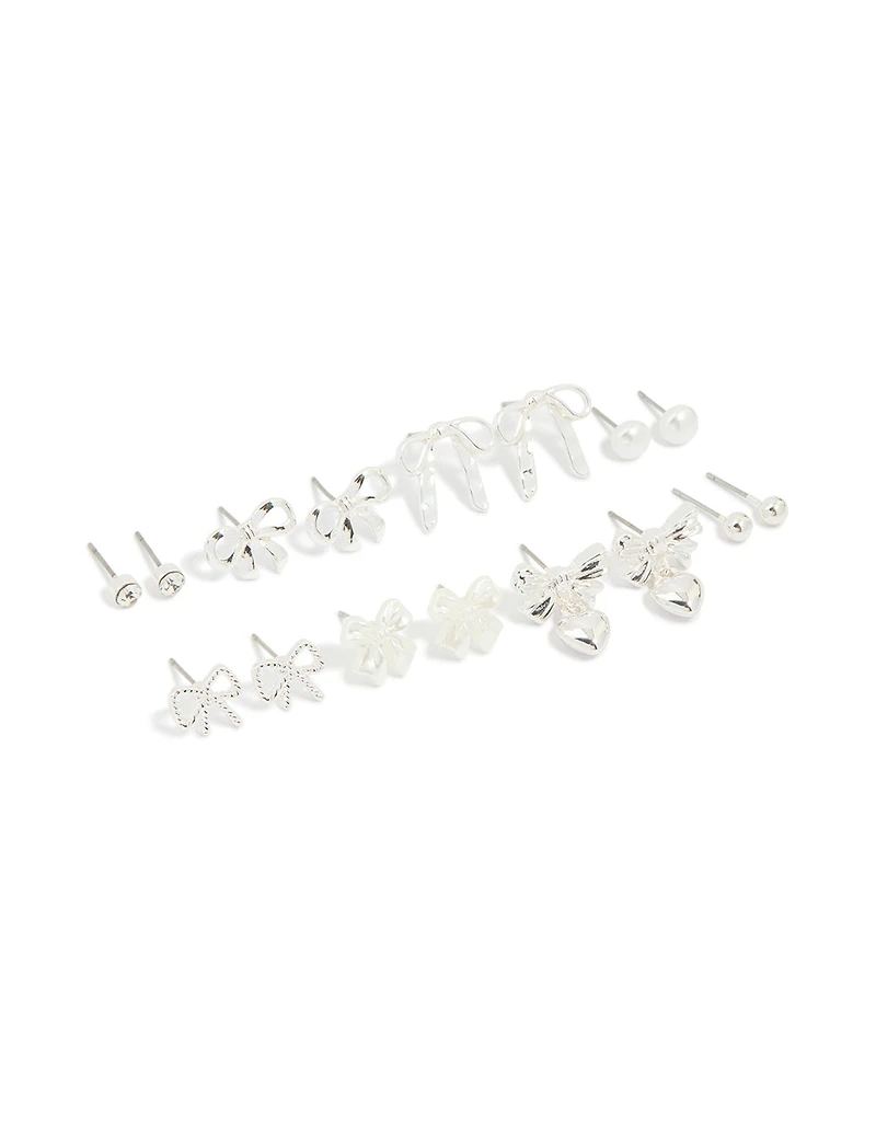 Silver Pearl & Bow Mixed Stud Earrings 8-Pack